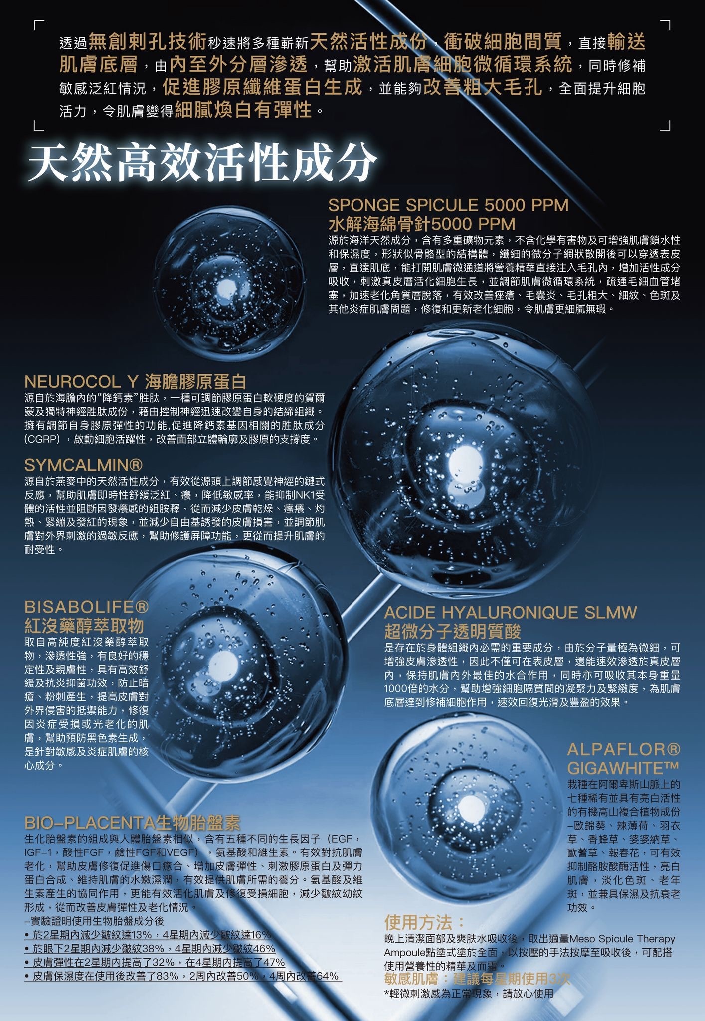 源於海洋天然成分,含有多重礦物元素,不含化學有害物及可增強肌膚鎖水性 和保濕度,形狀似骨骼型的結構體,纖細的微分子網狀散開後可以穿透表皮 層,直達肌底,能打開肌膚微通道將營養精華直接注入毛孔內,增加活性成分 吸收,刺激真皮層活化細胞生長,並調節肌膚微循環系統,疏通毛細血管堵 塞,加速老化角質層脫落,有效改善痤瘡、毛囊炎、毛孔粗大、細紋、色斑及 其他炎症肌膚問題,修復和更新老化細胞,令肌膚更細膩無瑕。
