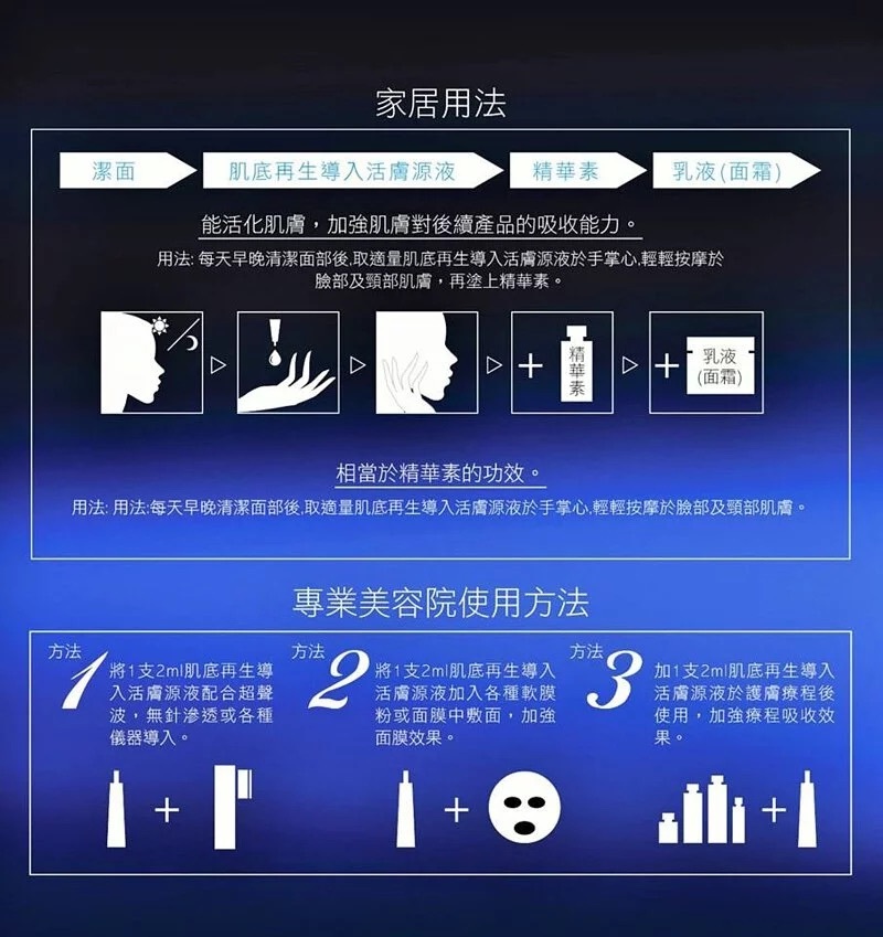 加1支2ml肌底再生導入活膚源液於護膚療程後使用,加強療程吸收效果。